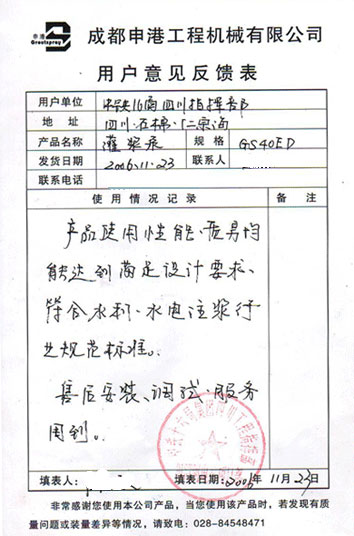 2006年11月23日,田灣河流域仁宗海電站中鐵十六局項(xiàng)目部將GS40ED雙液灌漿泵的使用情況返回我公司,對(duì)設(shè)備進(jìn)行了評(píng)定。(見《用戶意見反饋表》)。